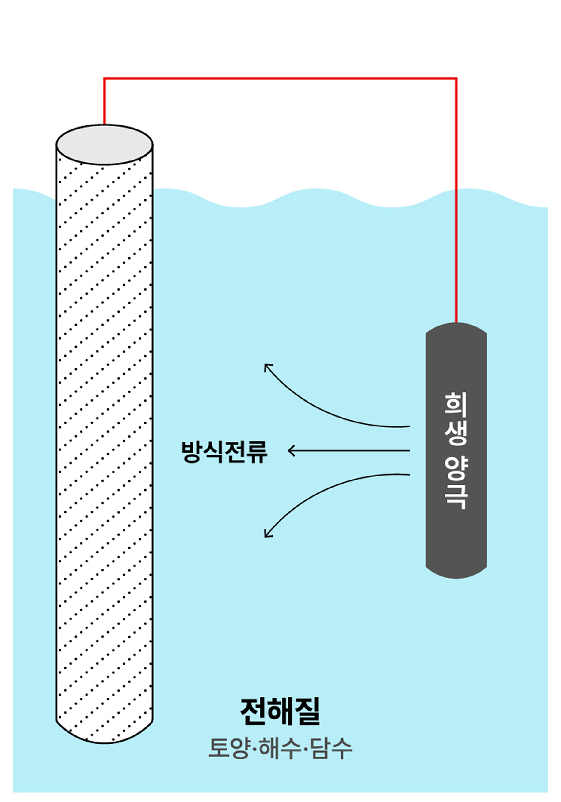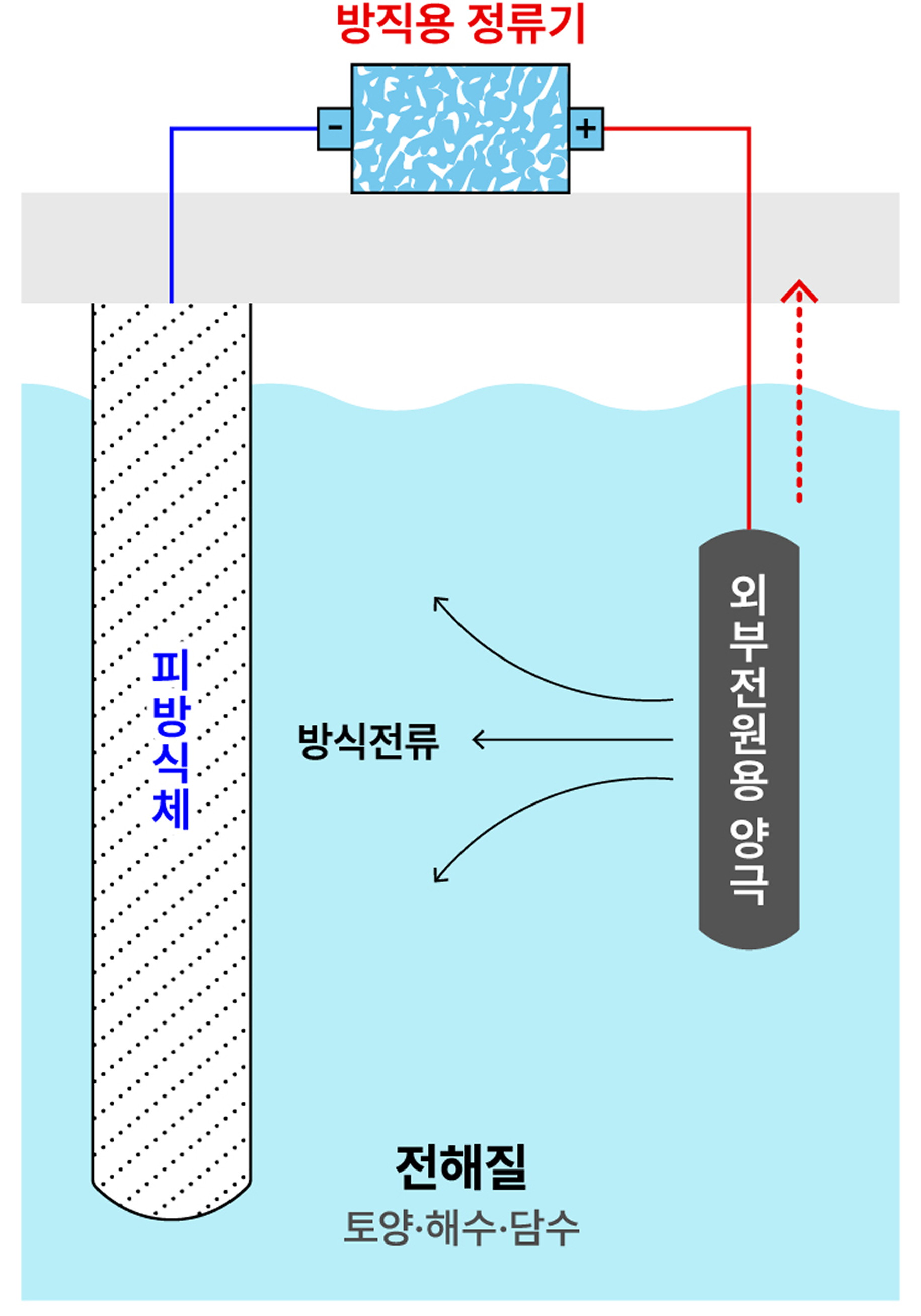 피방식체는 (-)극, 외부전원용 양극에는 (+)극을 연결해 외부전원을 공급하여 양극의 방식전류가 전해질을 통해 피방식체에 유입되어 부식을 방지합니다.